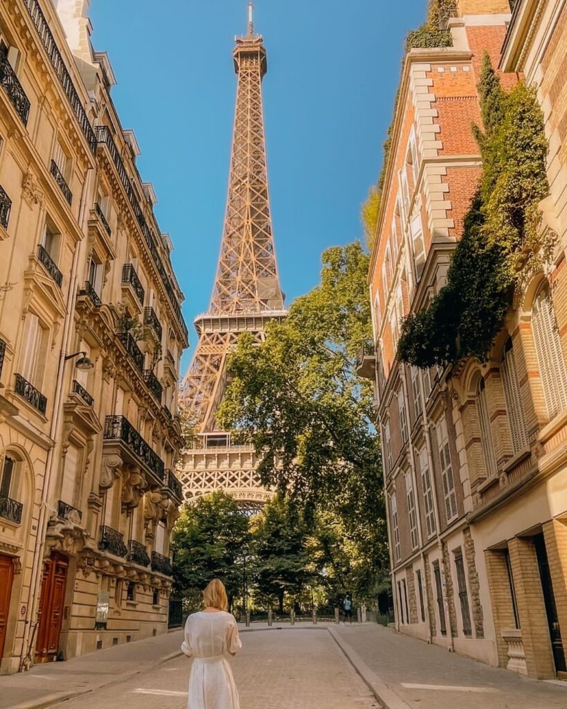 Then, visit another amazing spot – Rue de l’Université. A quiet street that beautifully frames the tower between elegant Haussmann buildings.